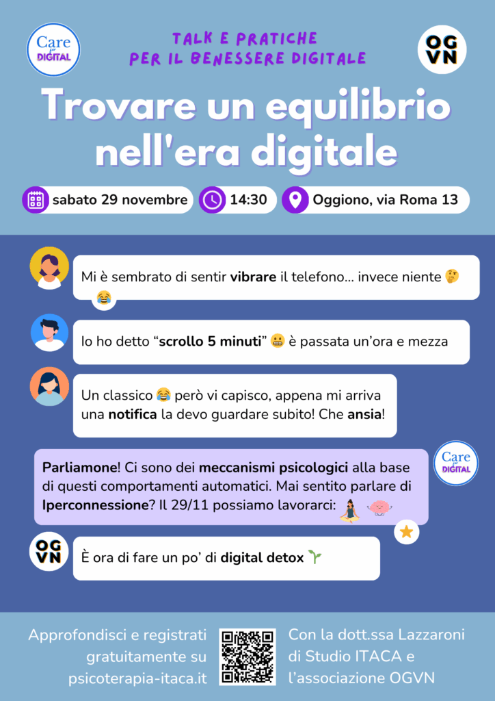 Alle 14:30 la dott.ssa Elisa Lazzaroni terrà un talk dal titolo “Trovare un equilibrio nell’era digitale” in collaborazione con OGVN – Associazione Giovani di Oggiono. Sarà un momento per riflettere insieme sul tema del benessere digitale, comprendere i meccanismi psicologici che regolano il nostro rapporto con la tecnologia e scoprire strategie pratiche per un uso più consapevole e sano dei dispositivi.
